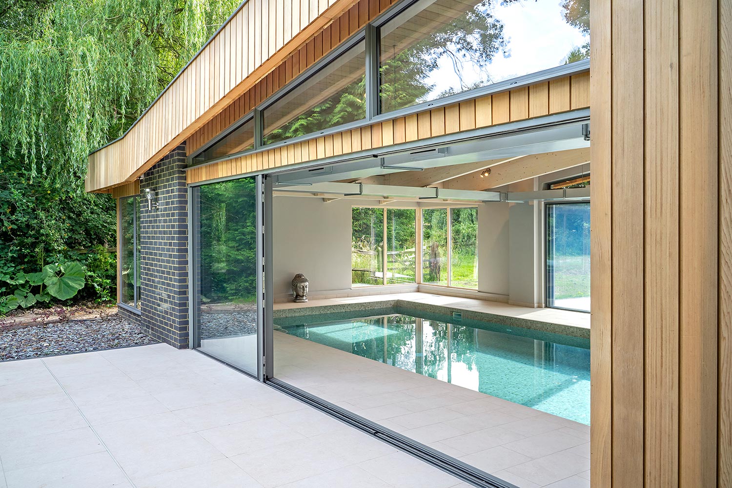 Completely bespoke, this distinctive blue brick and cedar-clad pool building with its contemporary form, has become the centrepiece of this property’s garden.